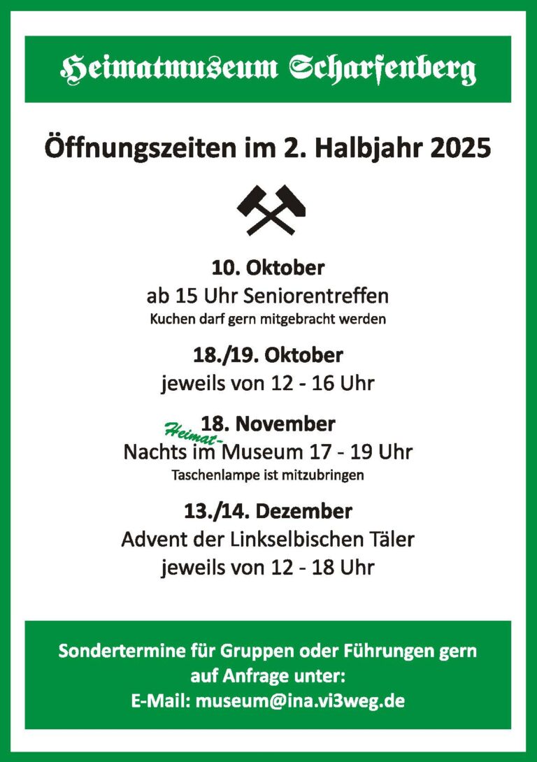 Das Heimatmuseum Scharfenberg wird 2025 an folgenden Wochenenden seine Türen und Fensterläden wieder für Gäste öffnen