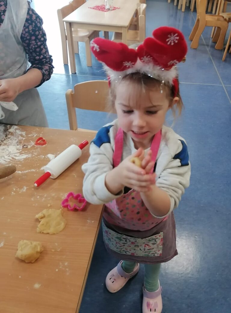 Ein weiterer Höhepunkt war das Plätzchenbacken im Altenheim Taubenheim. Gemeinsam mit den Bewohnerinnen und Bewohnern wurde geknetet, ausgestochen und natürlich auch genascht. Doch nicht nur dort duftete es herrlich nach Weihnachten – auch im Kindergarten selbst wurden fleißig Plätzchen gebacken.
